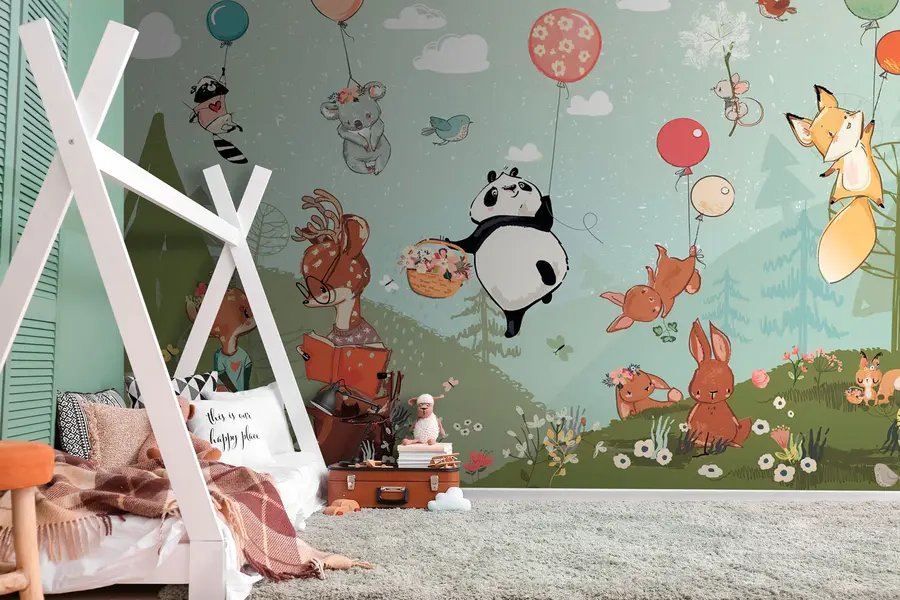 Montañas, nubes, bosque, globo aerostático, sol y pájaros.
