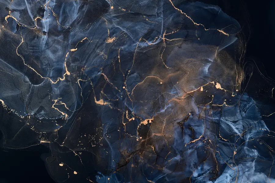 Arte fluido abstracto en azul y blanco, que se asemeja a agua y tinta que fluyen.