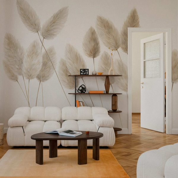 Plumas abstractas y en capas en tonos crema, beige y azul claro, con un aspecto texturizado y orgánico.