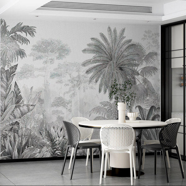 Un bosque brumoso con textura y altos pinos pintados de imitación.