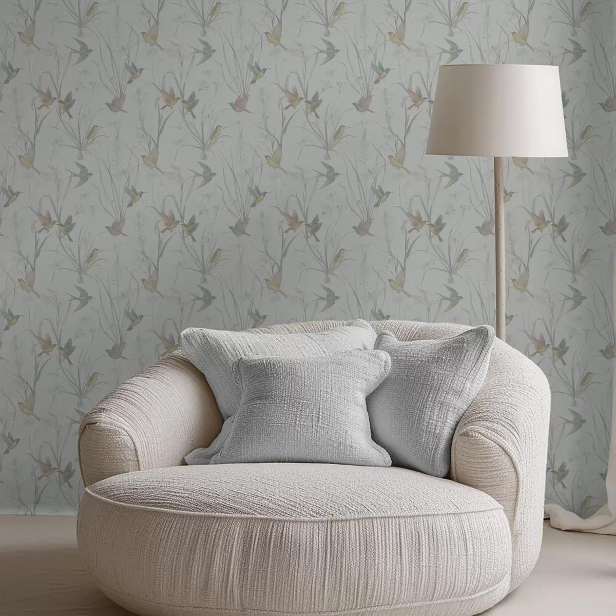 Papel pintado Pájaros entre la hierba del prado sobre un fondo gris claro. Nr. a00776v1