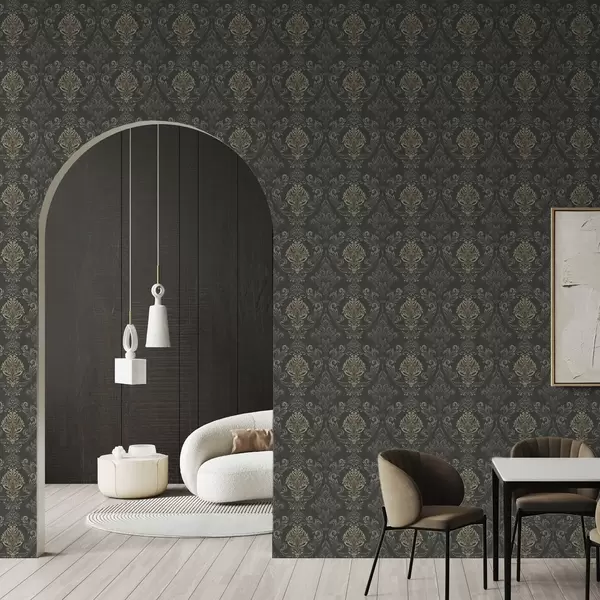 Papel pintado Damasco sobre fondo grafito oscuro, detalles en ocre oliva. Nr. a00828v5