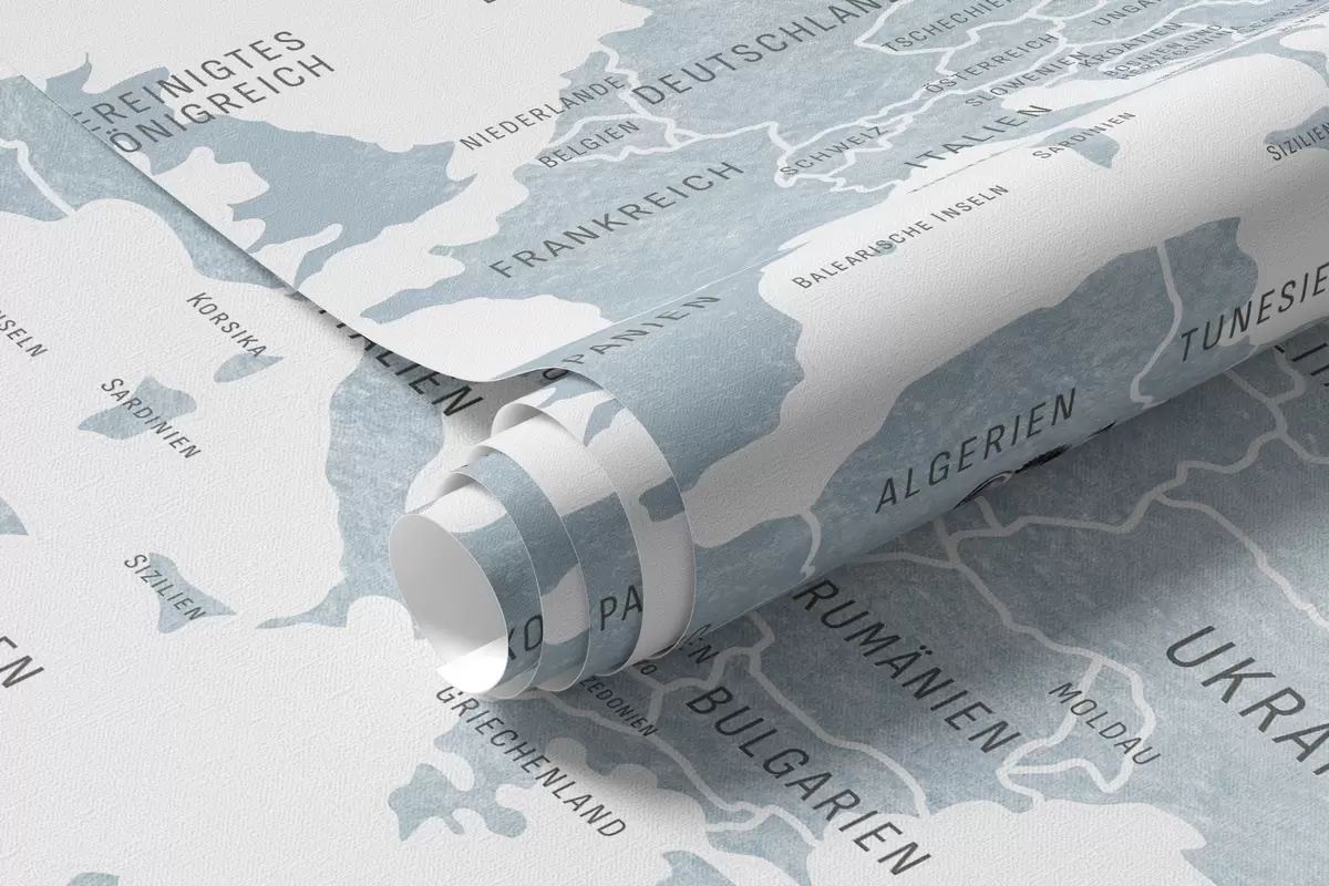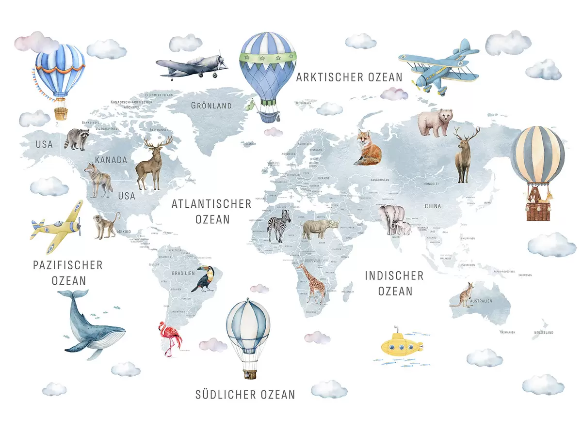 Fotomurales Mapa infantil en estilo acuarela con animales y globos aerostáticos. En alemán. Color azul. Nr. c00001dev1