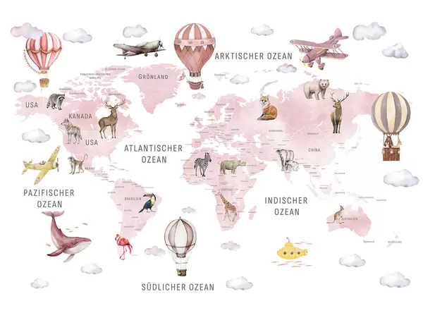 Fotomurales Mapa infantil en estilo acuarela con animales y globos aerostáticos. En alemán. Color rosa. Nr. c00001dev3