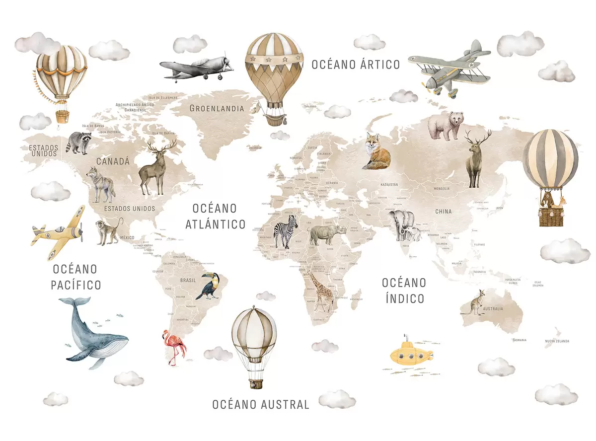 Fotomurales Mapa infantil en estilo acuarela con animales y globos aerostáticos. En español. Color beige. Nr. c00001esv2