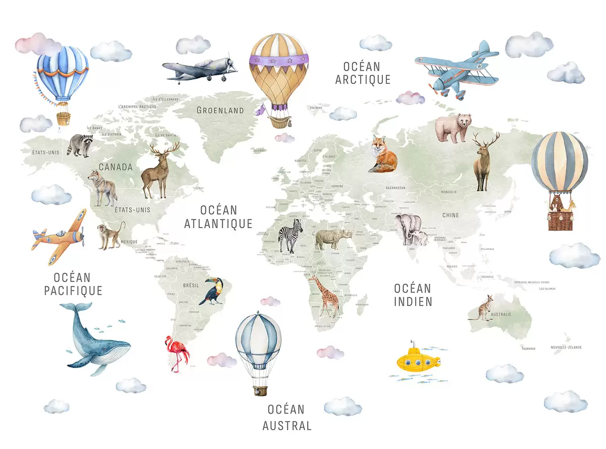 Fotomurales Mapa infantil en estilo acuarela con animales y globos aerostáticos. En francés. Color verde. Nr. c00001fr