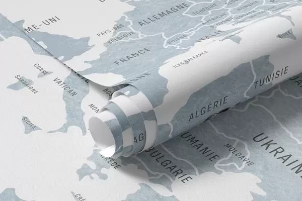 Fotomurales Mapa infantil en estilo acuarela con animales y globos aerostáticos. Idioma francés. Color azul. Nr. c00001frv1