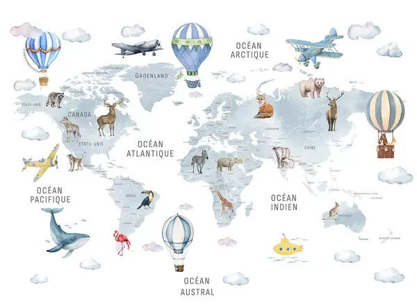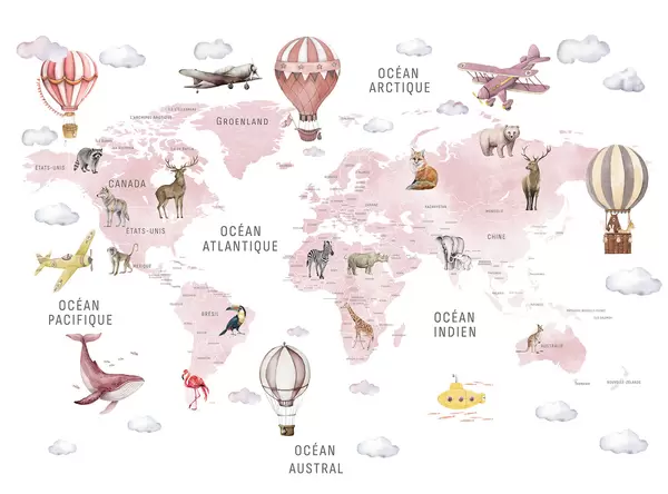 Fotomurales Mapa infantil en estilo acuarela con animales y globos aerostáticos. En francés. Color rosa. Nr. c00001frv3