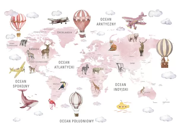 Fotomurales Mapa infantil en estilo acuarela con animales y globos aerostáticos. Idioma polaco. Color beige. Nr. c00001plv2