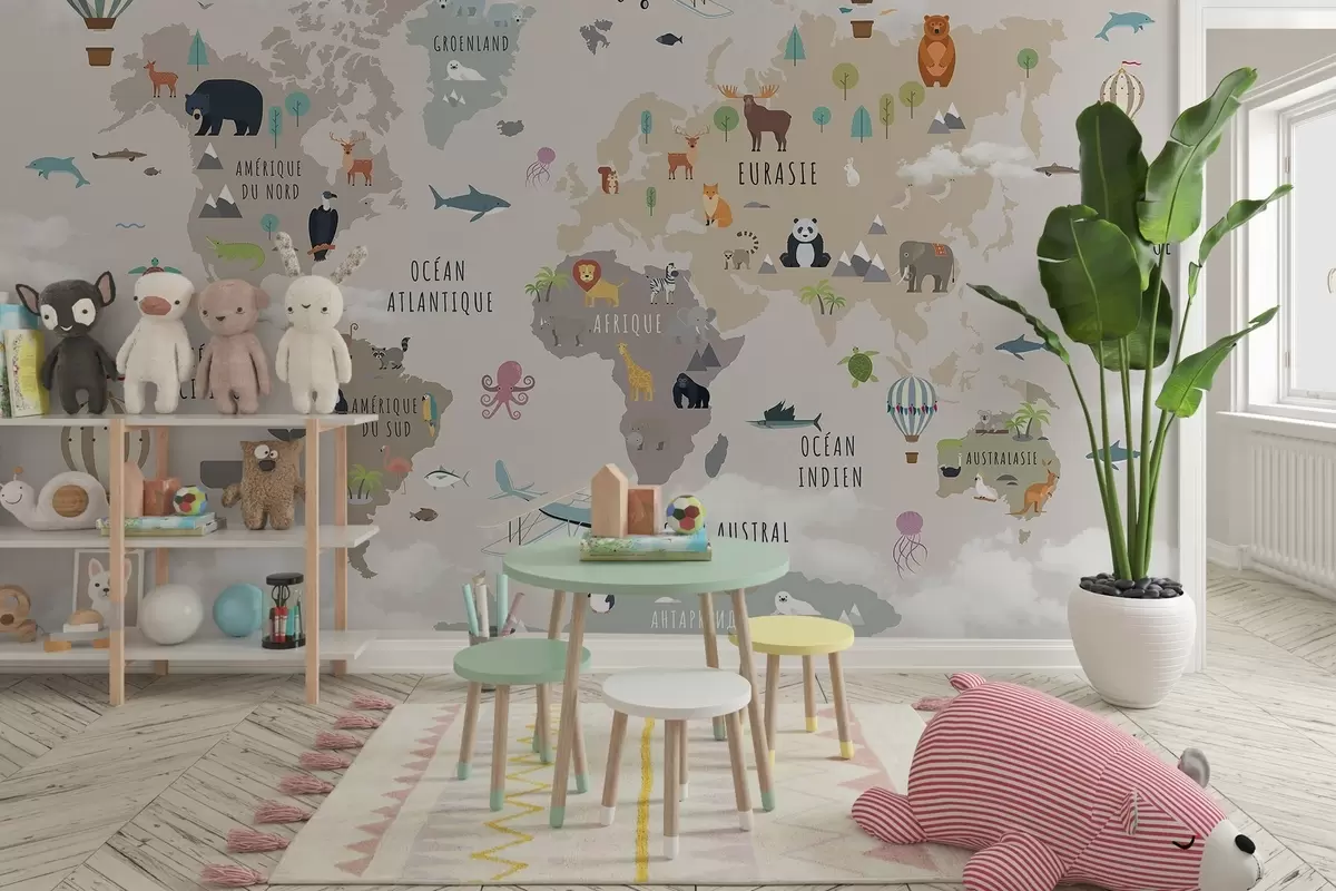 Fotomurales Mapa del mundo infantil con animales y globos aerostáticos. Idioma francés. Nr. c00002fr