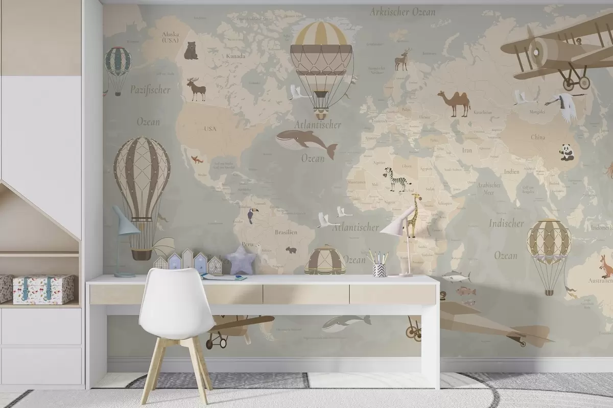 Fotomurales Mapa mundial infantil con animales, aviones y globos aerostáticos. En alemán. Color beige. Nr. c00003de