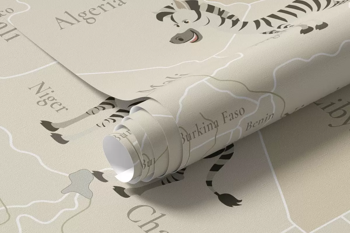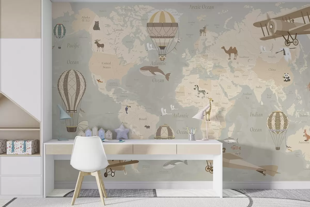 Fotomurales Mapa mundial infantil con animales, aviones y globos aerostáticos. En inglés. Color beige Nr. c00003en