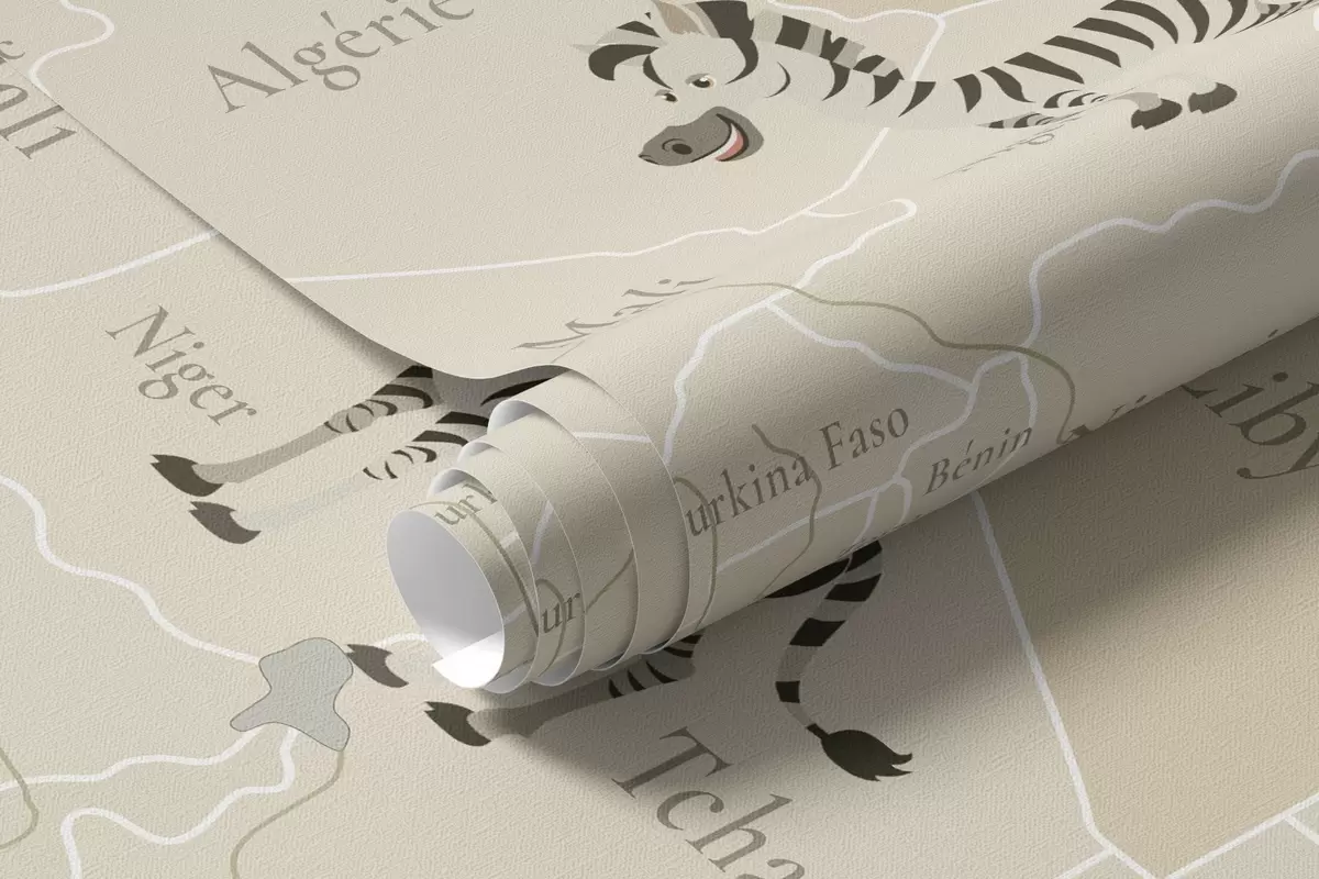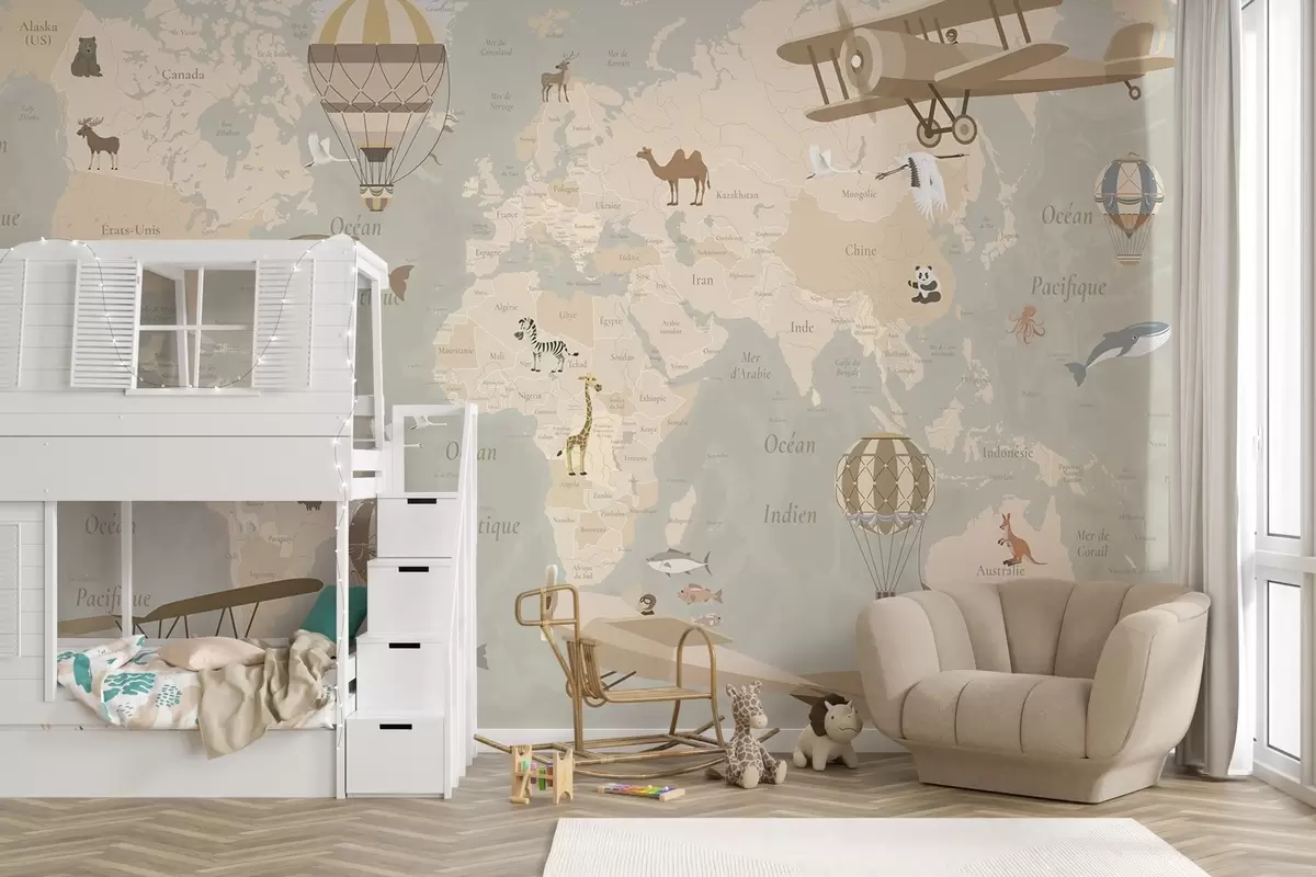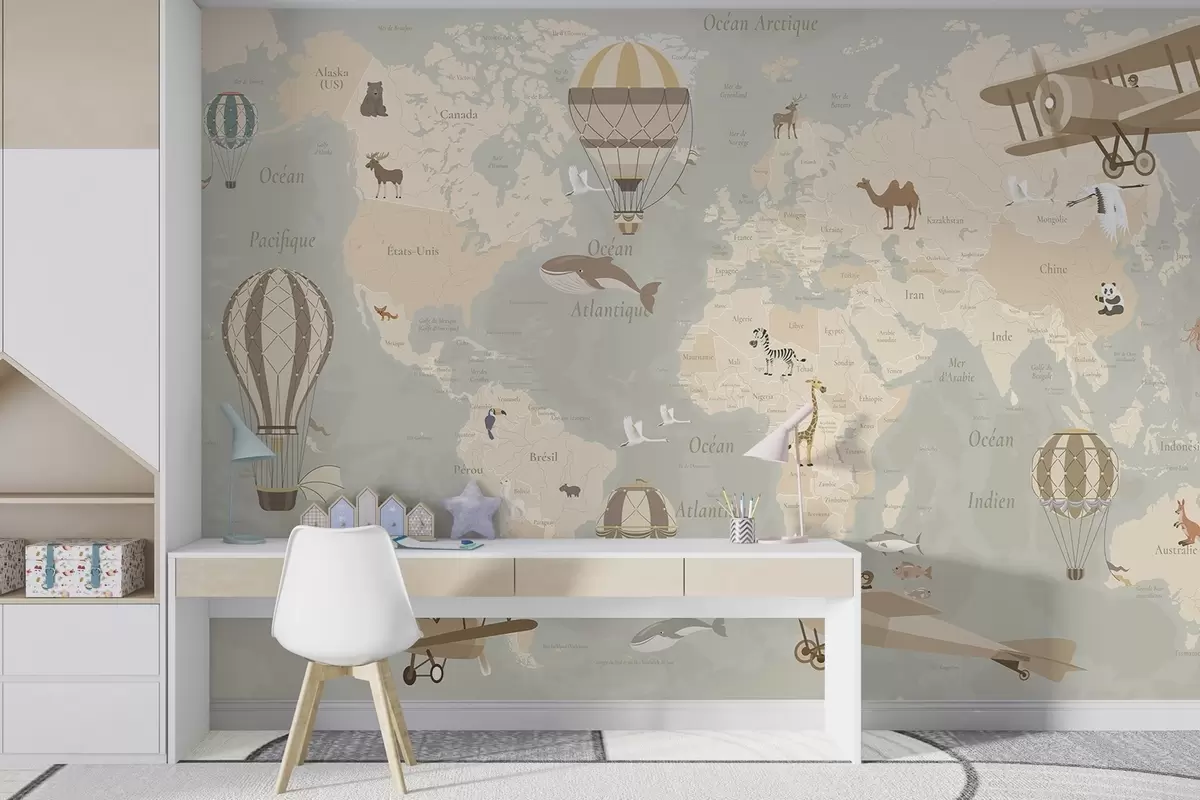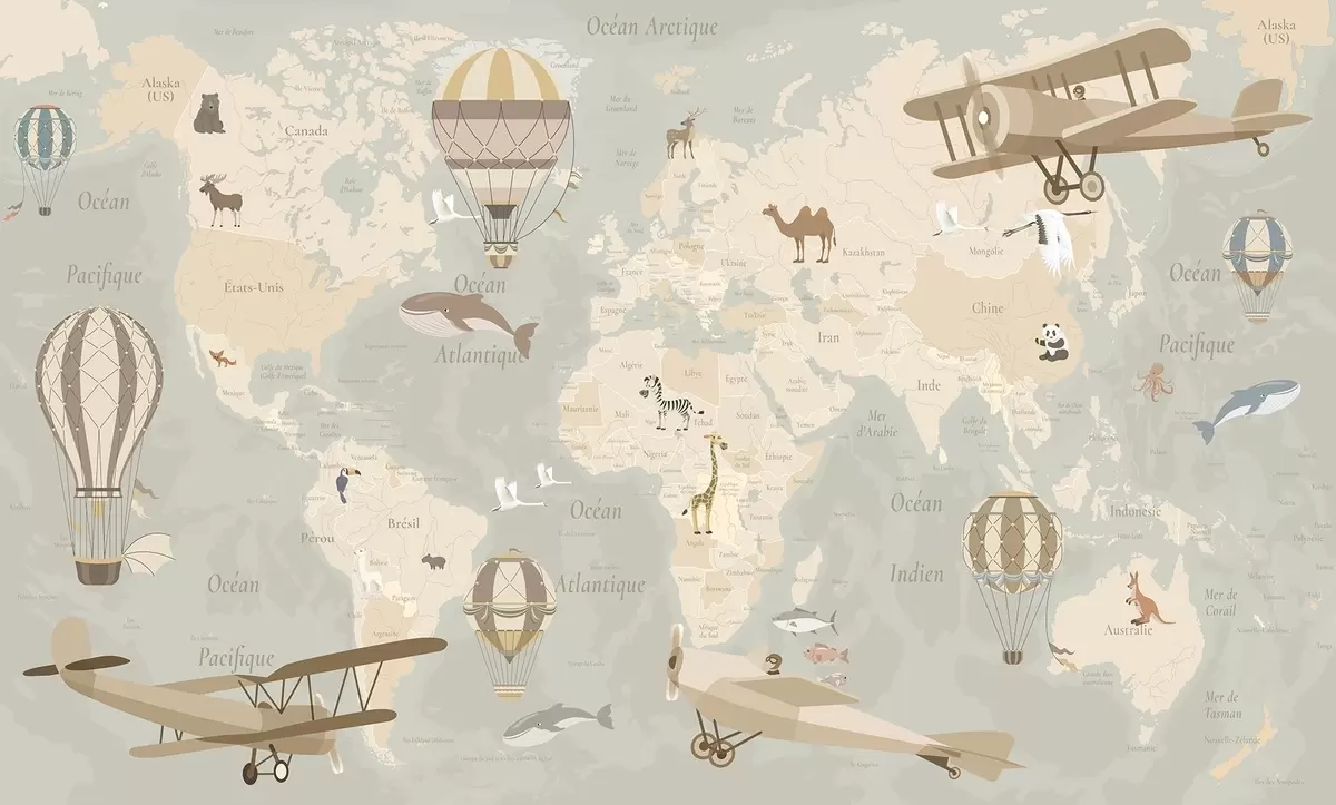 Fotomurales Mapa mundial infantil con animales, aviones y globos aerostáticos. Idioma francés. Color beige Nr. c00003fr