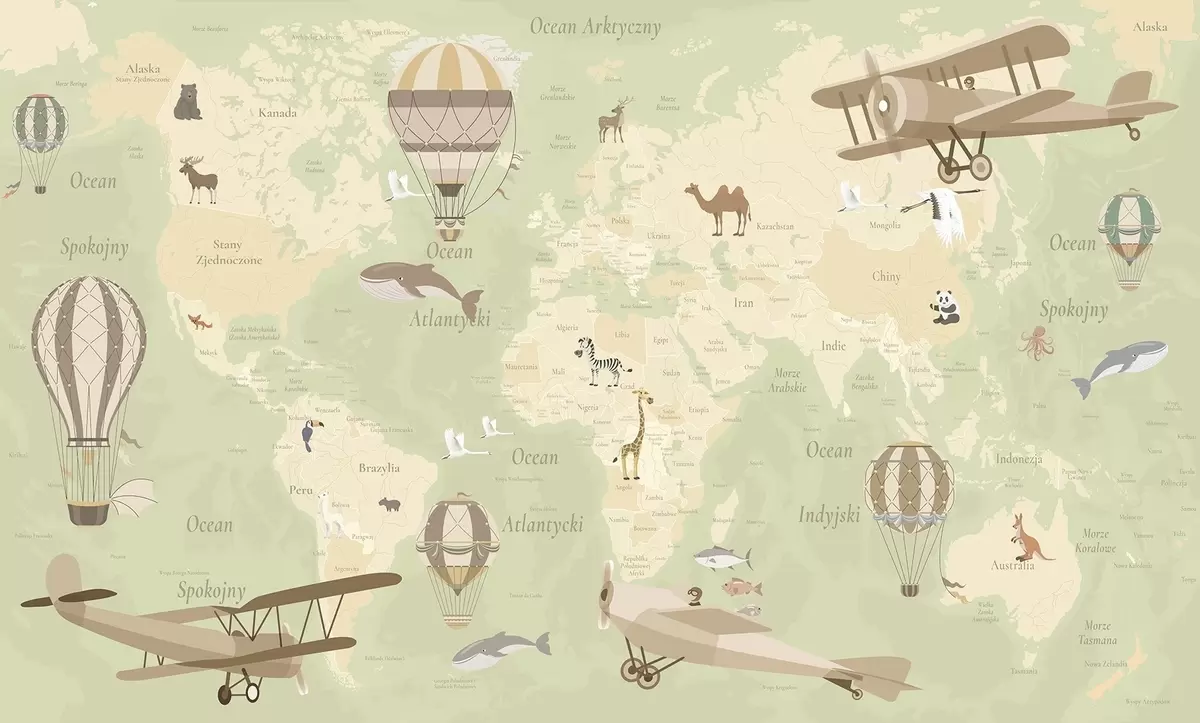 Fotomurales Mapa mundial infantil con animales, aviones y globos aerostáticos. Idioma polaco. Color verde. Nr. c00003plv2