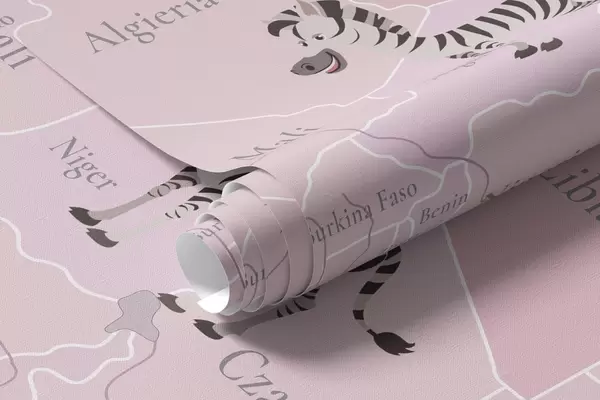 Fotomurales Mapa mundial infantil con animales, aviones y globos aerostáticos. Idioma polaco. Color rosa. Nr. c00003plv3