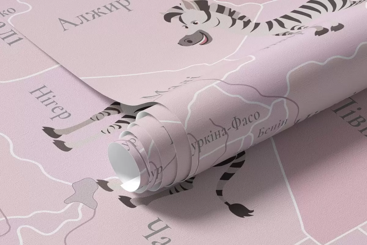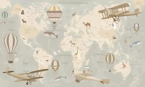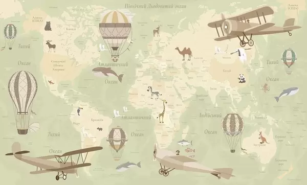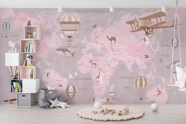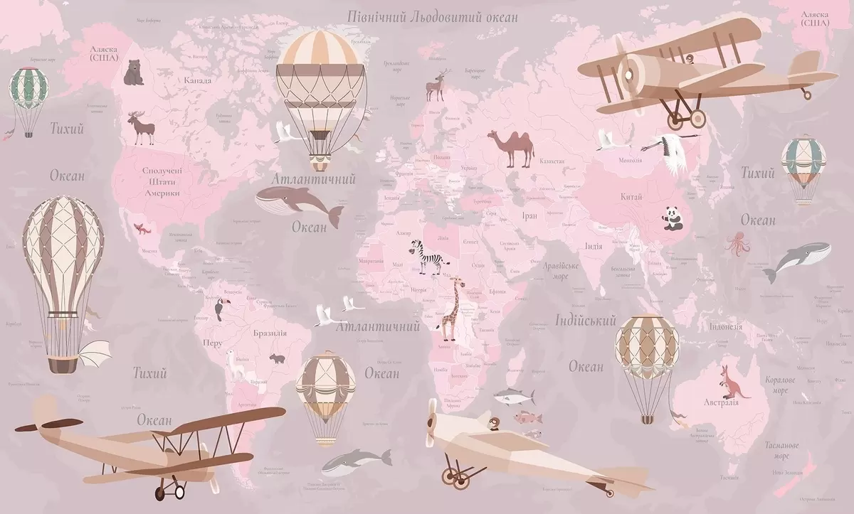 Fotomurales Mapa mundial infantil con animales, aviones y globos aerostáticos. Idioma ucraniano. Color rosa. Nr. c00003ukv3