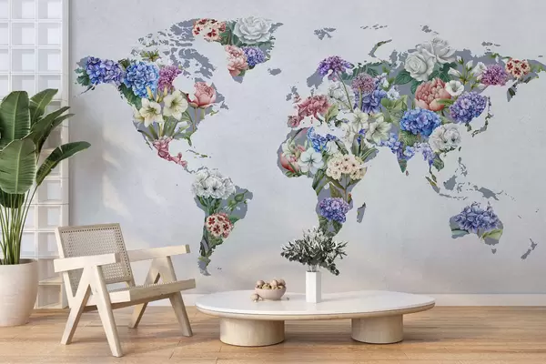 Fotomurales Un colorido mapa del mundo elaborado con una gran variedad de flores de vivos colores Nr. c00006