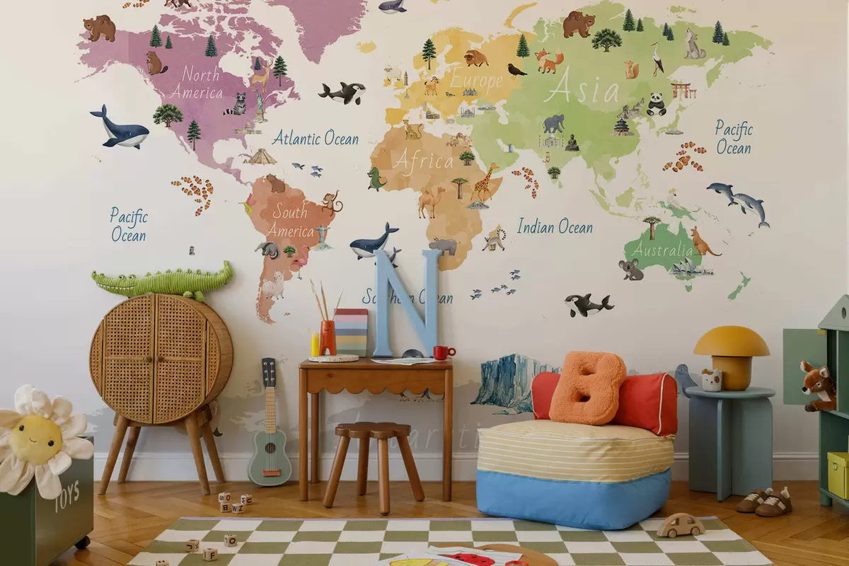 Fotomurales Un mapa a color con estilo de acuarela en el que aparecen animales, plantas y elementos arquitectónicos. Etiquetas en inglés Nr. c00009en