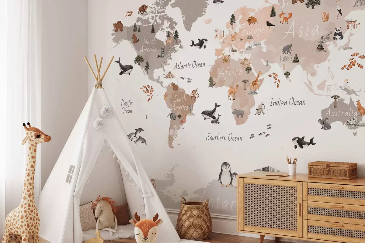 Fotomurales Un mapa en tonos beige, con un estilo de acuarela, en el que aparecen animales, plantas y elementos arquitectónicos. Etiquetas en inglés Nr. c00009env3