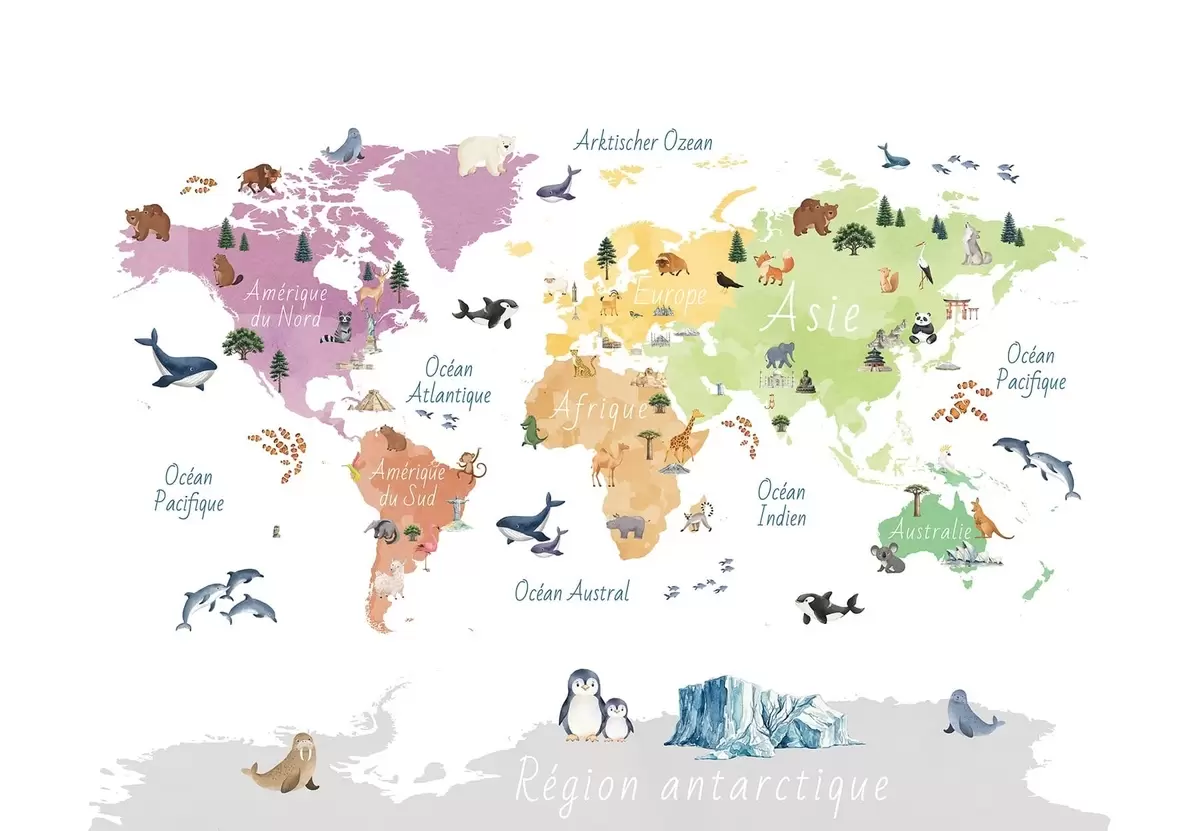 Fotomurales Un mapa a color con estilo de acuarela en el que aparecen animales, plantas y elementos arquitectónicos. Etiquetas en francés Nr. c00009fr