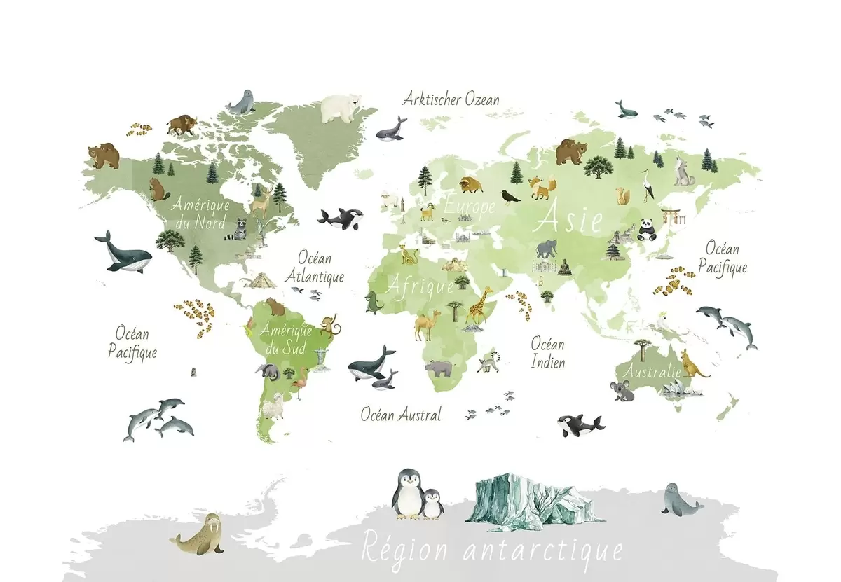 Fotomurales Un mapa de Green en estilo acuarela con animales, plantas y arquitectura. Etiquetas en francés Nr. c00009frv2