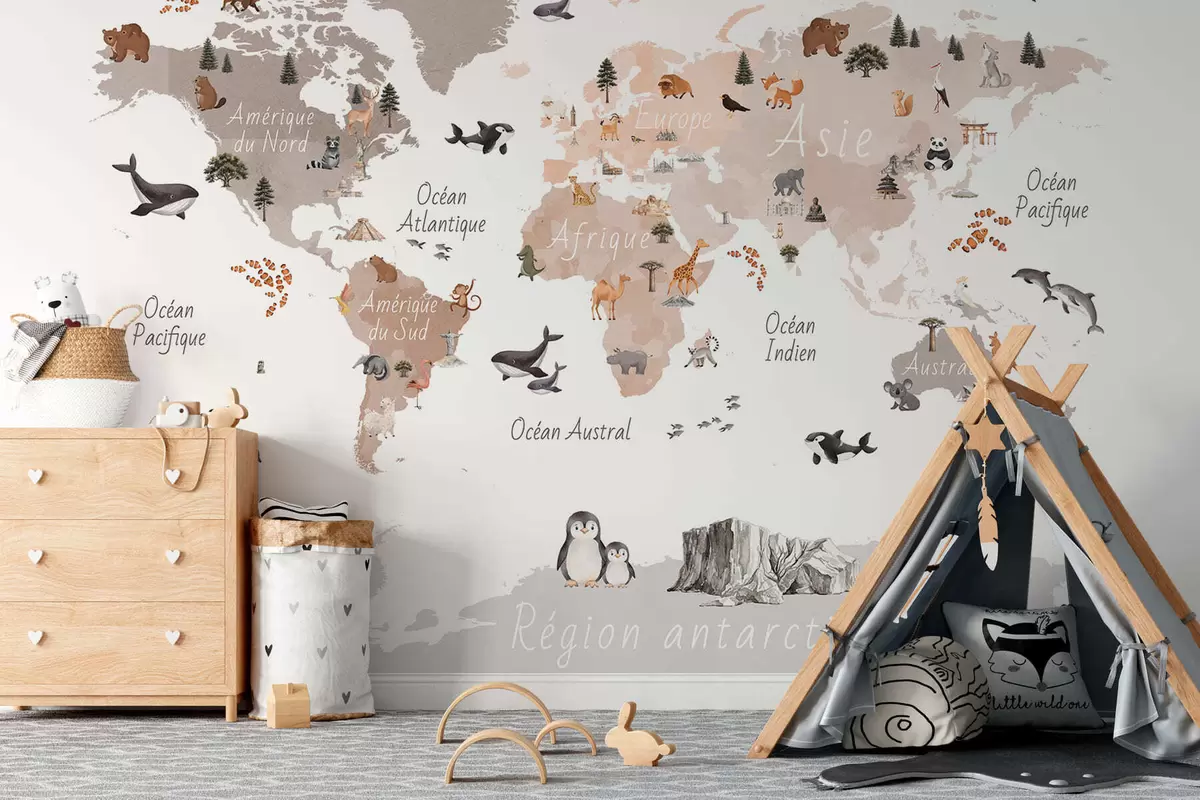 Fotomurales Un mapa en tonos beige, con un estilo de acuarela, en el que aparecen animales, plantas y elementos arquitectónicos. Rótulos en francés Nr. c00009frv3