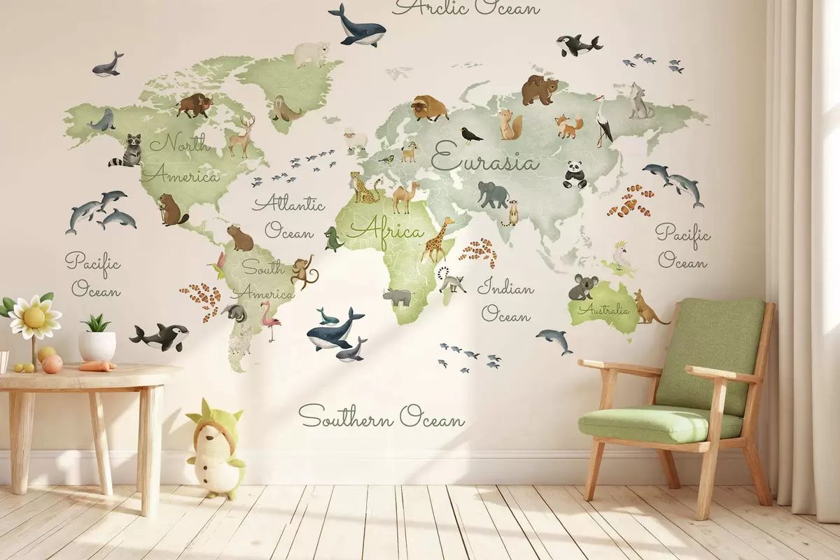 Fotomurales Un mapa verde con estilo de acuarela en el que aparecen animales. Etiquetas en inglés Nr. c00012env2