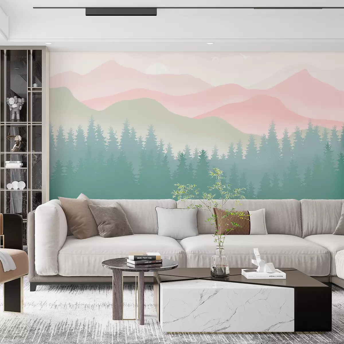 Fotomurales Montañas neblinosas con bosque de pinos, colores naturales suaves, rosa y verde Nr. u98774