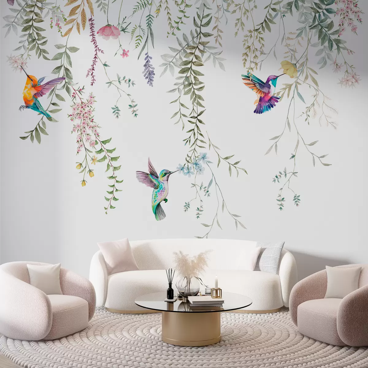 Fotomurales Flores y hojas colgantes y hermosos colibríes. Nr. w00660