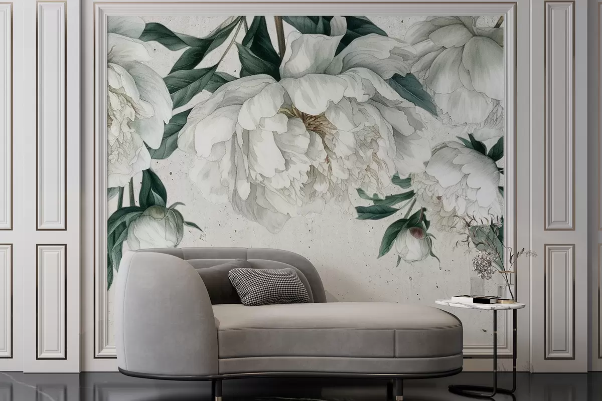 Fotomurales Peonías grandes blancas con hojas verdes sobre un fondo de textura clara Nr. w00837