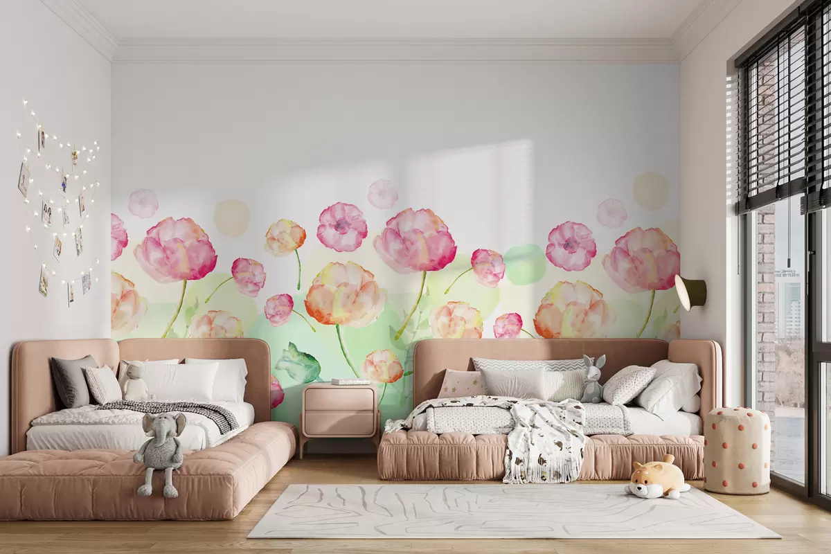 Fotomurales Tulipanes de color rojo anaranjado y rosa en técnica de acuarela sobre fondo blanco con manchas verdes Nr. w01028
