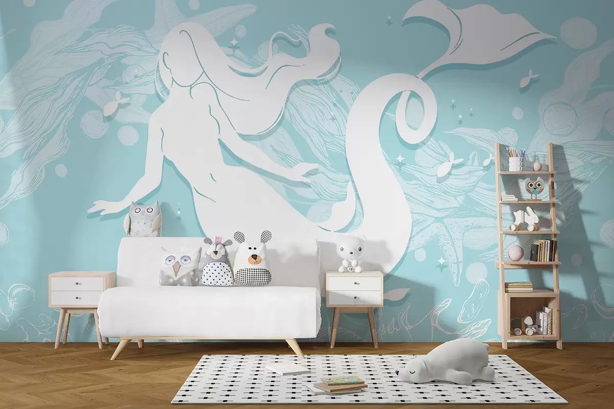 Fotomurales Una sirena blanca con cabello largo y suelto nadando en un océano azul claro con olas blancas y burbujas. Nr. w01316