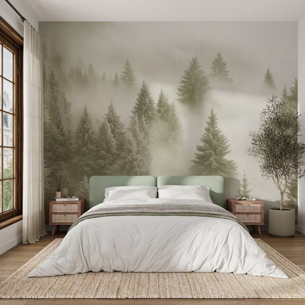 Fotomurales Espesa niebla que envuelve un bosque nevado por la mañana en suaves tonos verdes Nr. w02064v2