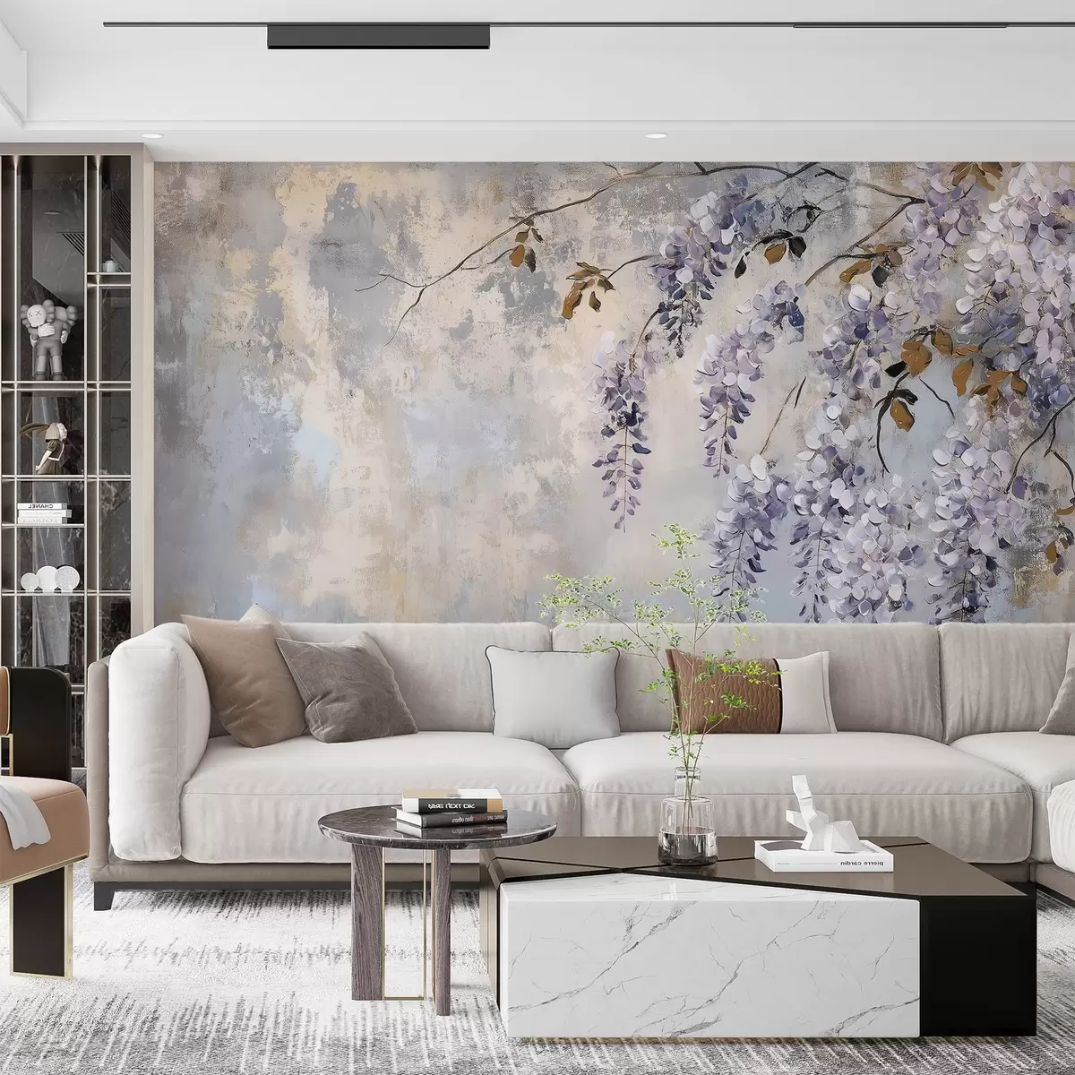 Fotomurales papel pintado texturizado en colores suaves y apagados con delicadas flores y ramas de glicinia. Nr. w02451