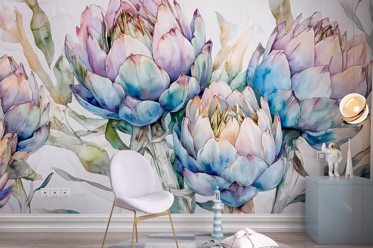 Fotomurales Alcachofas dibujo, estilo acuarela, floral, púrpura, beige, verde Nr. w02484