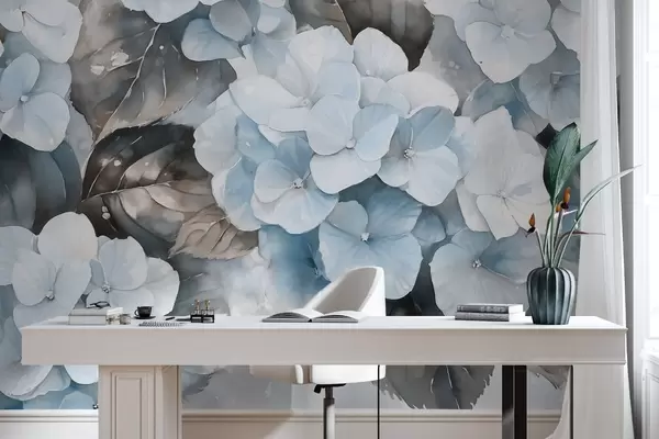 murales de pared Flores de hortensia, dibujo estilo acuarela, colores azules, floral w02488v1
