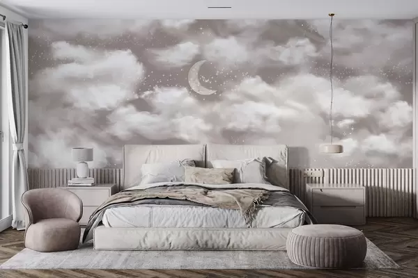 murales de pared Cielo estrellado con luna y nubes, soñador, etéreo, colores beige suaves w02515