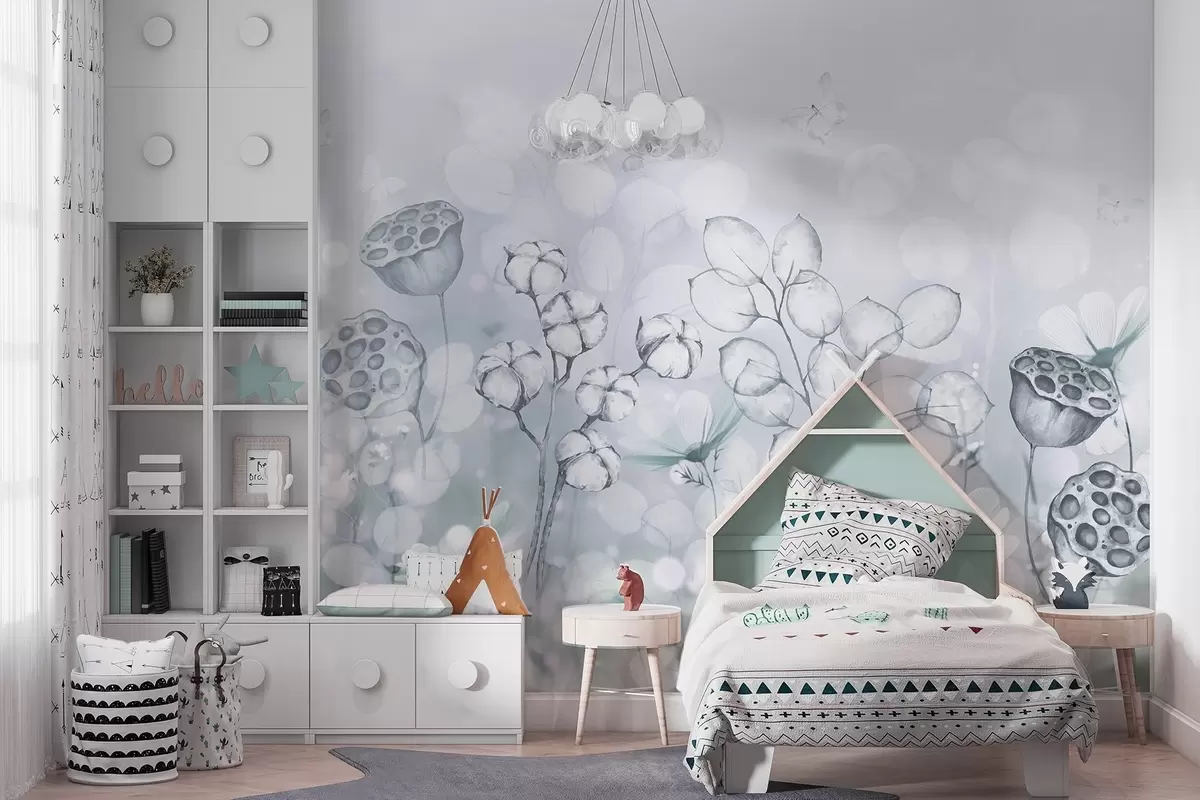 Fotomurales Jardín de flores de ensueño, mariposa, flores de algodón, lotos, colores grises Nr. w02516v2