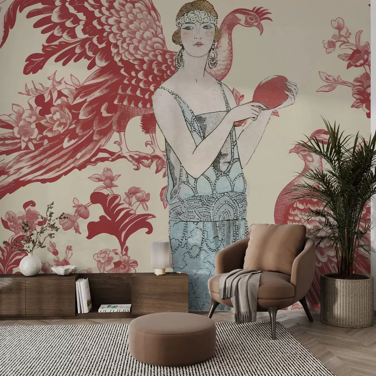 Fotomurales Elegante motivo floral vintage con una mujer en tonos rojos Nr. w02532v1