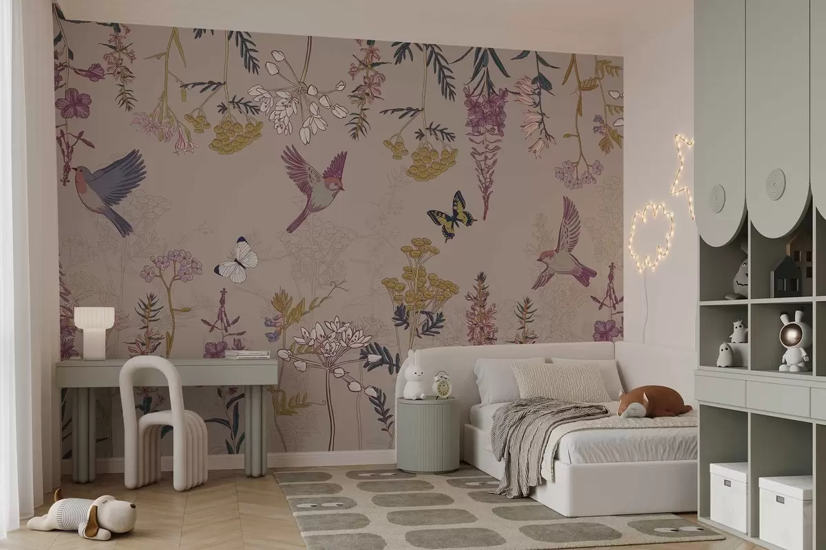 Fotomurales un conjunto de flores silvestres y pájaros sobre fondo beige Nr. w02634