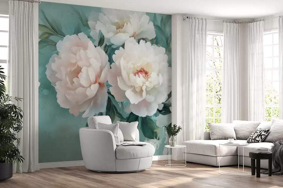 Fotomurales grandes flores de exuberantes peonías sobre fondo turquesa Nr. w02763