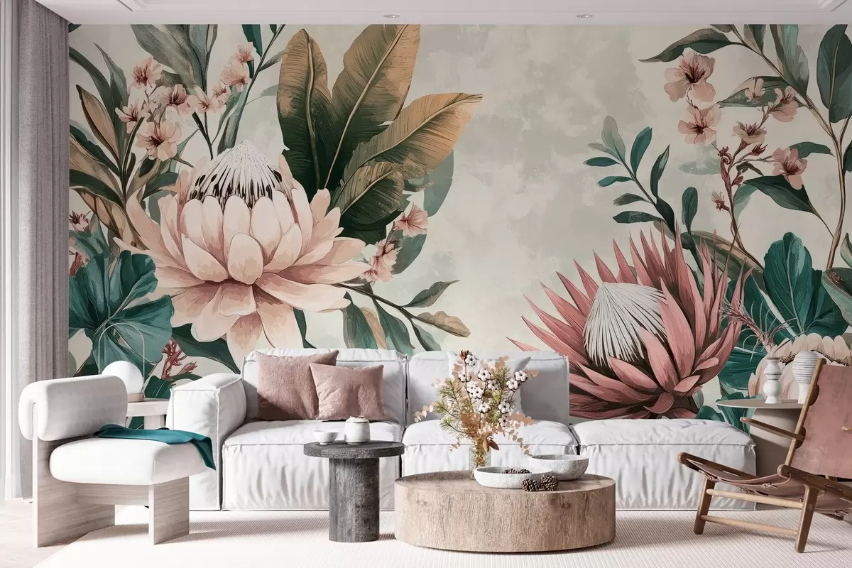 Fotomurales plantas exóticas, hojas de palmera y flores de protea inspiradas en el vintage Nr. w03015