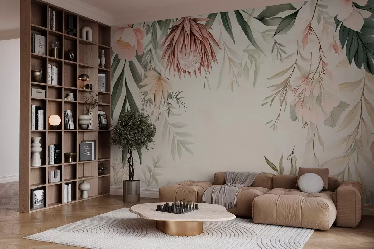 Fotomurales Flor de protea entre varias hojas y plantas en cálidos tonos beige y verde Nr. w03019
