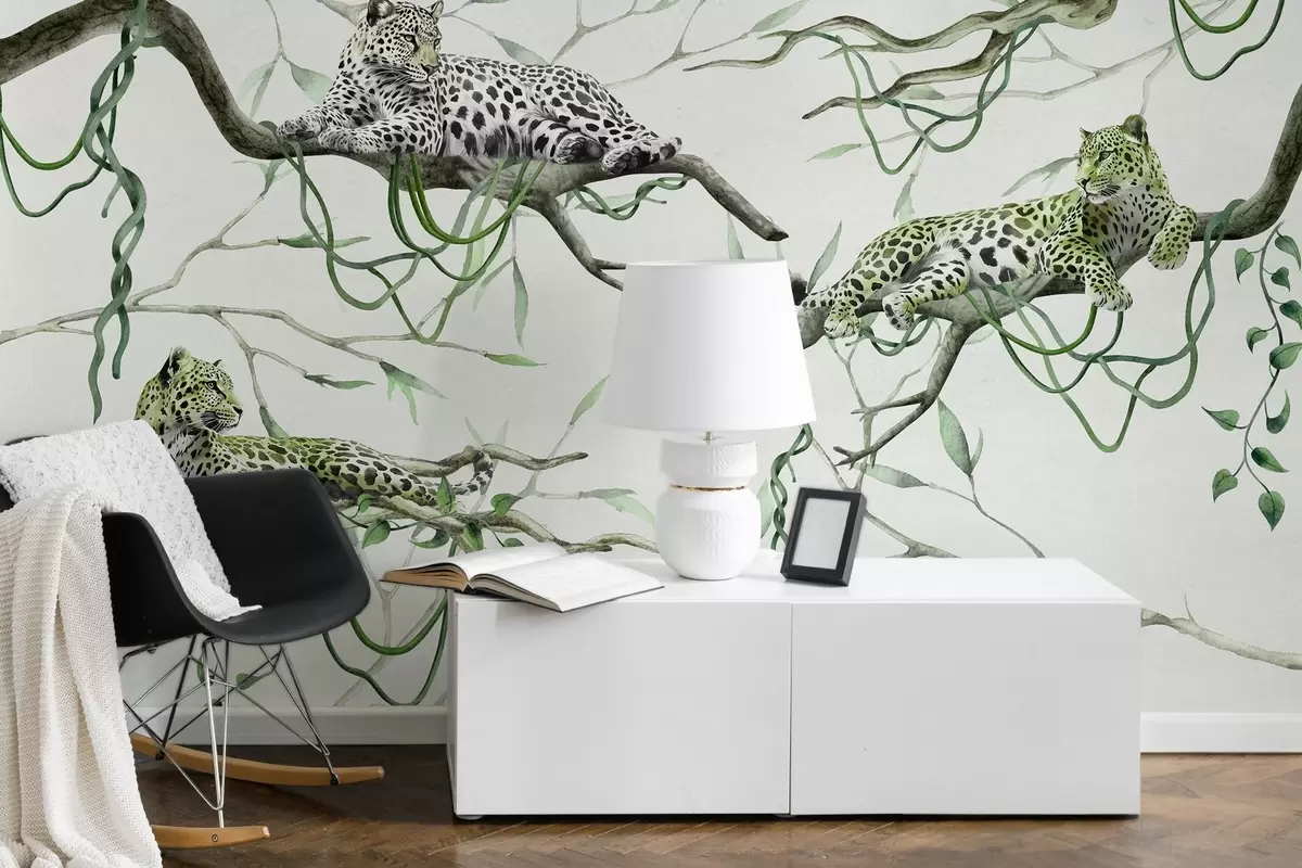 Fotomurales Leopardos en los árboles de la selva, lianas, tropical, animales salvajes, paleta de color verde Nr. w03146v1