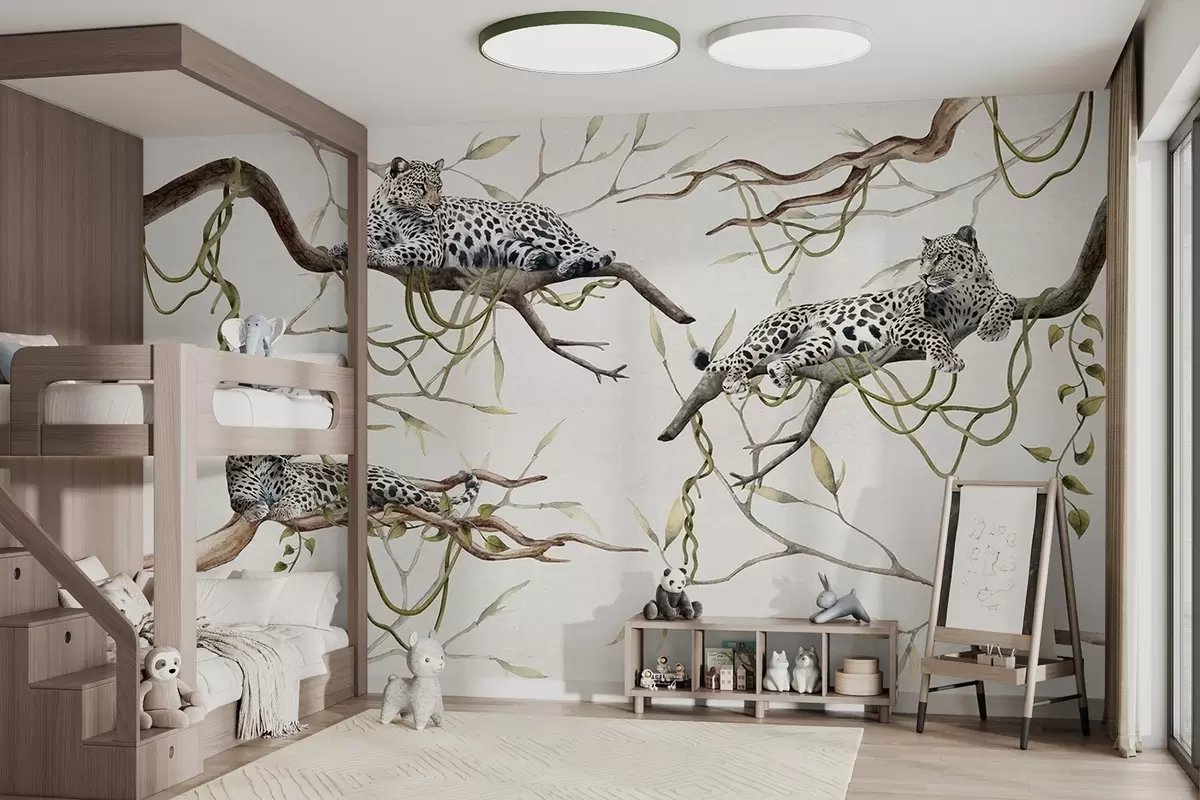 murales de pared Leopardos en los árboles de la selva, lianas, tropical, animales salvajes, paleta de colores pastel w03146v4