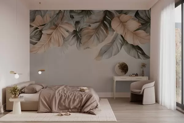 Fotomurales Hojas tropicales colgando de la parte superior, sobre un fondo texturizado Nr. w03290