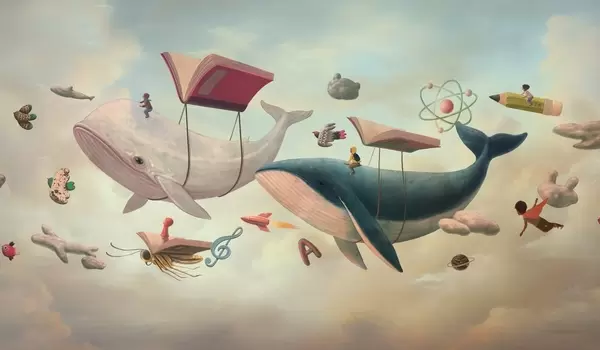 Fotomurales Una caprichosa ilustración de ballenas volando en el cielo bajo globos en forma de libro Nr. w03327
