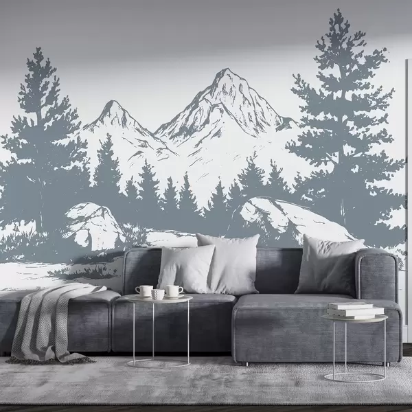 Fotomurales Los Alpes, montañas con bosque, dibujo lineal, color gris Nr. w03342v2