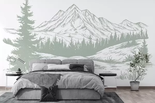 Fotomurales Paisaje de montaña con pinos, bosque, naturaleza, color verde suave Nr. w03344v1