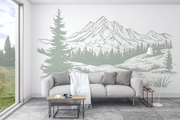 Fotomurales Paisaje de montaña con pinos, bosque, naturaleza, color verde suave Nr. w03344v1